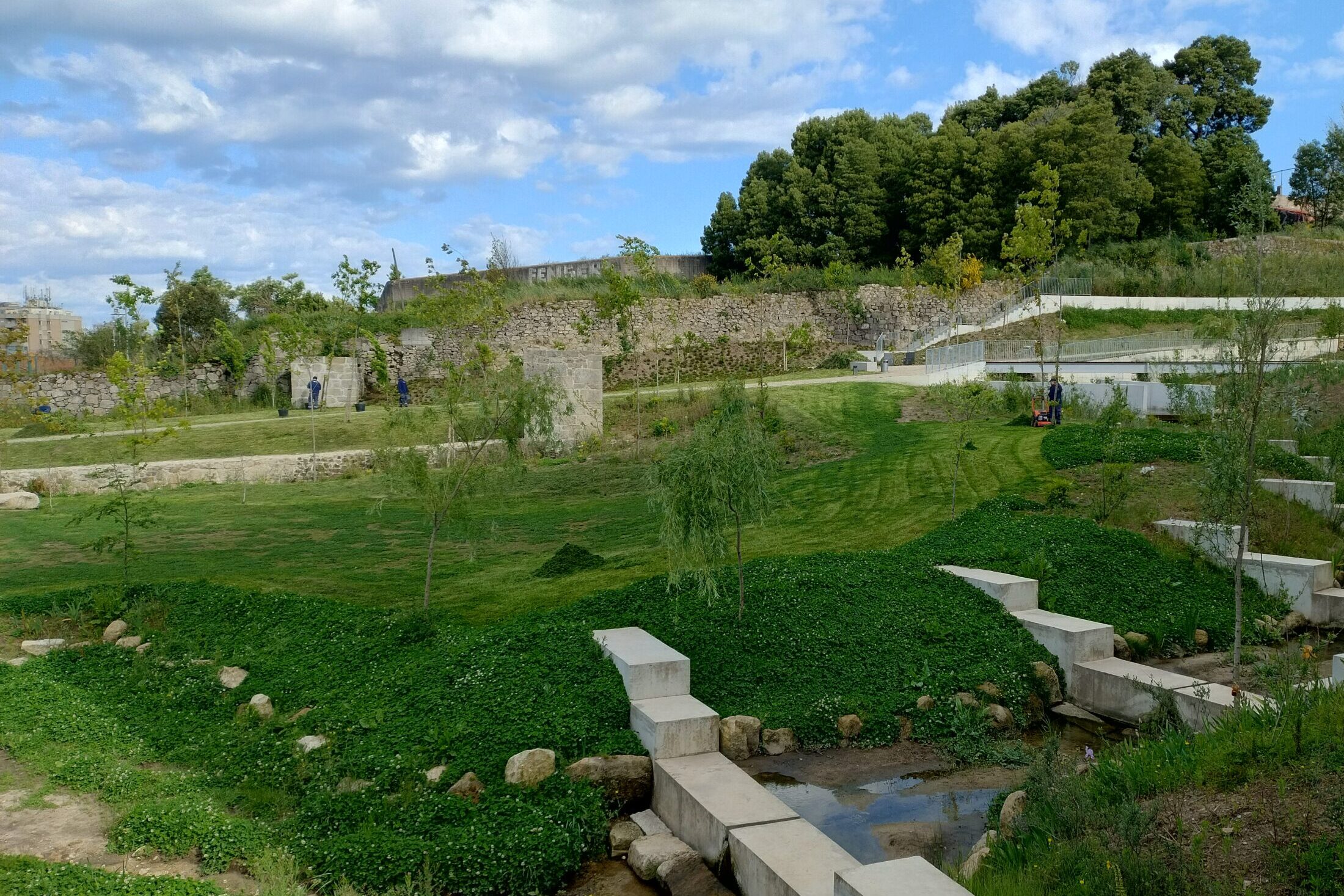 A renaturalização da Ribeira do Vilar, que eliminou o troço entubado ao longo da Rua de Cervantes, reforça a presença da água e promove a utilização de bacias de retenção que recolhem e infiltram as águas pluviais, prevenindo assim o risco de inundações. O curso de água foi desenhado com recurso a soluções baseadas na natureza, estabilizando as margens com enrocamento e estruturas vegetais ribeirinhas. Manteve-se o leito permeável e instalaram-se micro-açudes que permitem a oxigenação da água, criando em simultâneo, pequenas charcas resultantes do represamento. A meandrização do curso de água, a gárgula sobre o manancial, os micro-açudes, a levada e o lago, permitiram a criação de vários ritmos e ambientes, potenciando o sistema húmido e a regeneração da paisagem.