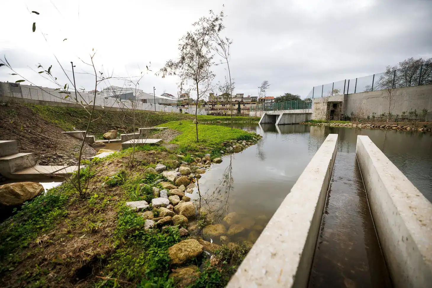 A renaturalização da Ribeira do Vilar, que eliminou o troço entubado ao longo da Rua de Cervantes, reforça a presença da água e promove a utilização de bacias de retenção que recolhem e infiltram as águas pluviais, prevenindo assim o risco de inundações. O curso de água foi desenhado com recurso a soluções de base natural, estabilizando as margens com enrocamento e estruturas vegetais ribeirinhas. Manteve-se o leito permeável e instalaram-se micro-açudes que permitem a oxigenação da água, criando em simultâneo, pequenas charcas resultantes do represamento. A meandrização do curso de água, a gárgula sobre o manancial, os micro-açudes, a levada e o lago, permitiram a criação de vários ritmos e ambientes, potenciando o sistema húmido e a regeneração da paisagem.
