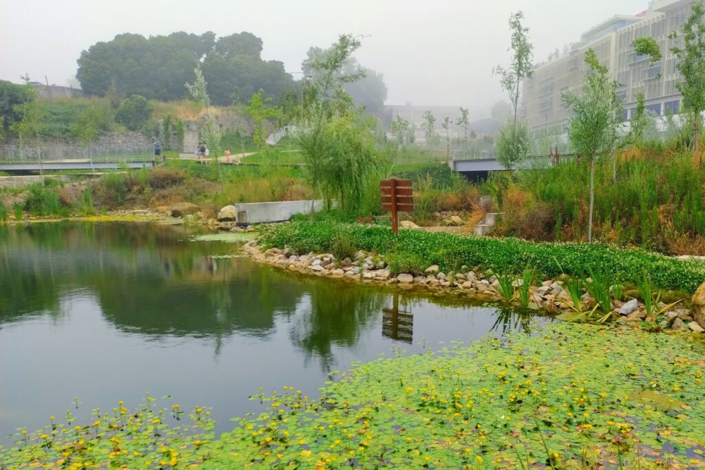 Um parque com um papel crucial, quer na valorização do espaço público, quer na estratégia de renaturalização da cidade. A bacia de retenção e o charco aumentam a biodiversidade local e a fitodepuração. As plantas aquáticas introduzidas ajudam a filtrar poluentes, fixar sedimentos e melhorar a purificação natural da água.